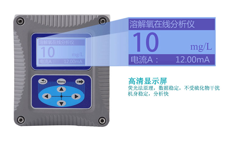 MIK-DO700溶解氧傳感器采用熒光法測量溶解氧,發出的藍光照射在熒光層上,熒光物質受到激發發出紅光,而氧濃度與熒光物質回到基態的時間成反比。采用了該方法測量溶解氧,測量時不會產生氧消耗,數據穩定,性能可靠,不存在干擾,安裝和校正簡單。 MIK-DO700控制器用于顯示傳感器所測得的數據,用戶可以通過控制器的界面配置和校準實現4-20mA模擬輸出。可以實現繼電器控制及數字通訊等功能。該產品普遍應用于污水廠、自來水廠、水站、地表水、養殖業、工業等領域溶解氧監測。